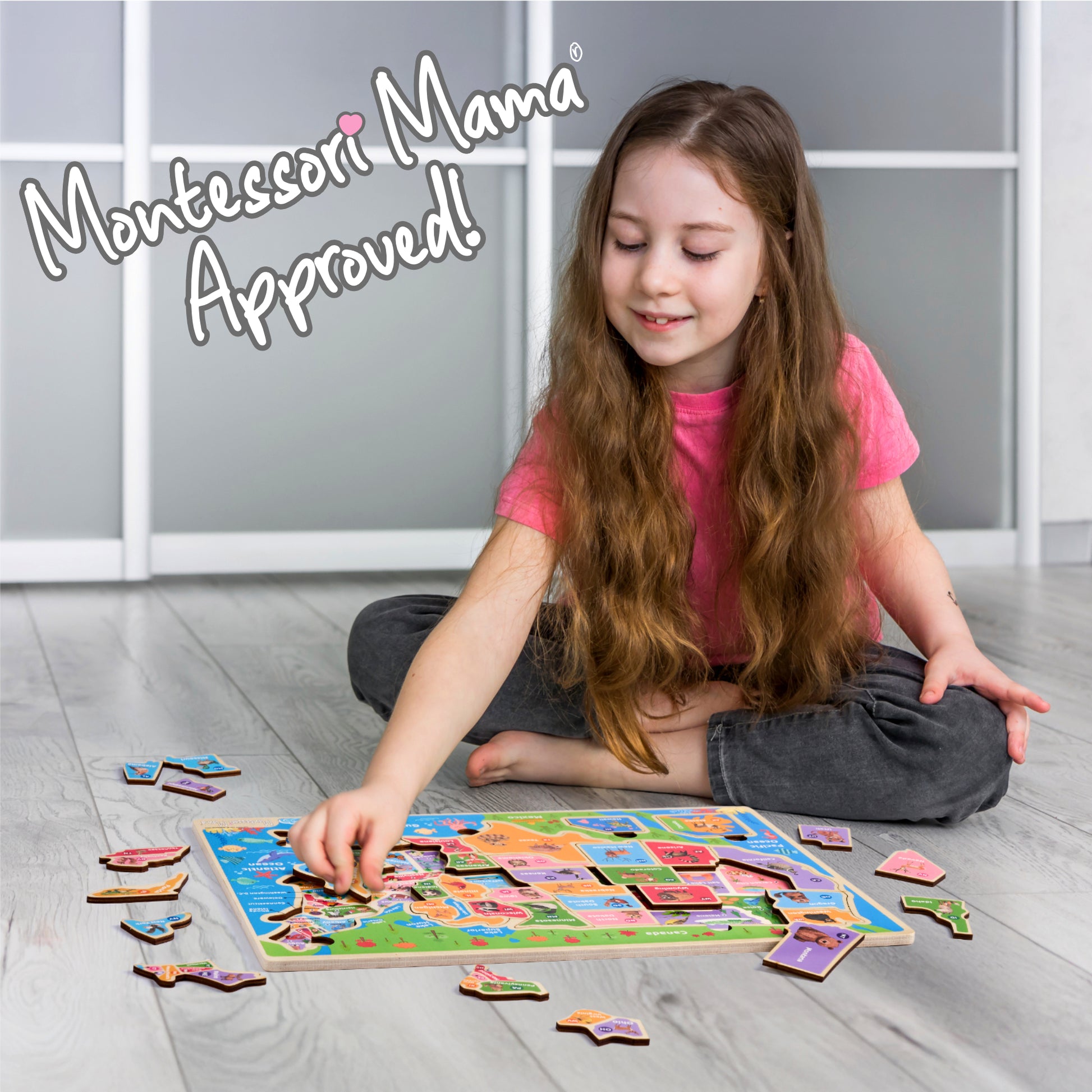 Help your child discover the United States with Montessori Mama’s Wooden USA Puzzle. Each colorful state is a separate puzzle piece, designed to teach U.S. geography, spatial awareness, and recognition of major regions and landmarks.